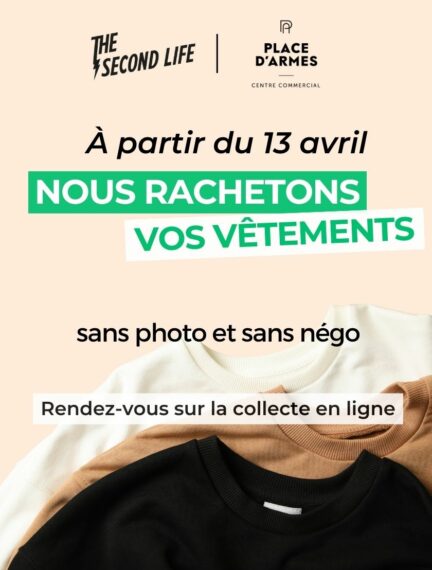 Vous avez des vêtements ou des objets que vous n’utilisez plus ? On a LA solution ! The Second Life, dans votre centre Place d’Armes, vous permet de les revendre facilement grâce à sa collecte en ligne, disponible 24/24h, 7/7j 😍